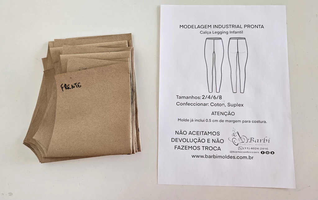 Kit de modelagem industrial pronta de Calça Legging infantil contendo as numerações 2/4/6/8 em papel kraft grosso, já pilotado e com margens de costura. Pronto para o uso.