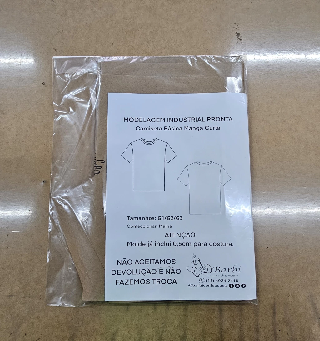 Kit de modelagem industrial pronta de Camiseta Básica Manga Curta contendo as numerações G1/G2/G3 em papel kraft grosso, já pilotado e com margens de costura. Pronto para o uso.