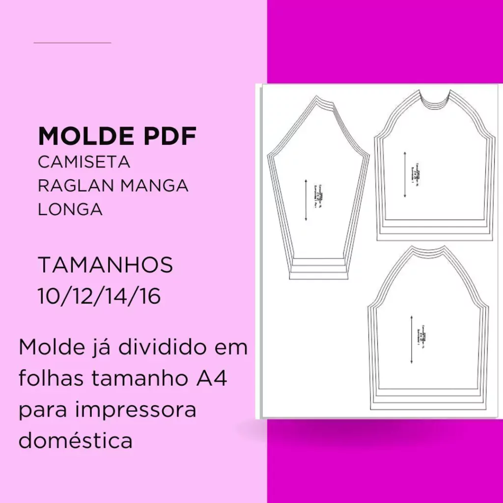 -Arquivo PDF modelagem Camiseta Raglan Manga Longa Tamanhos 10/12/14/16 em A4 um dentro do outro.