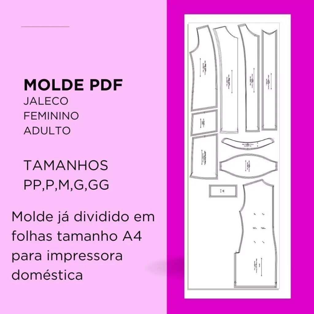 -Arquivo PDF modelagem Jaleco Infantil Feminino Tamanhos PP/P/M/G/GG em A4 um dentro do outro.