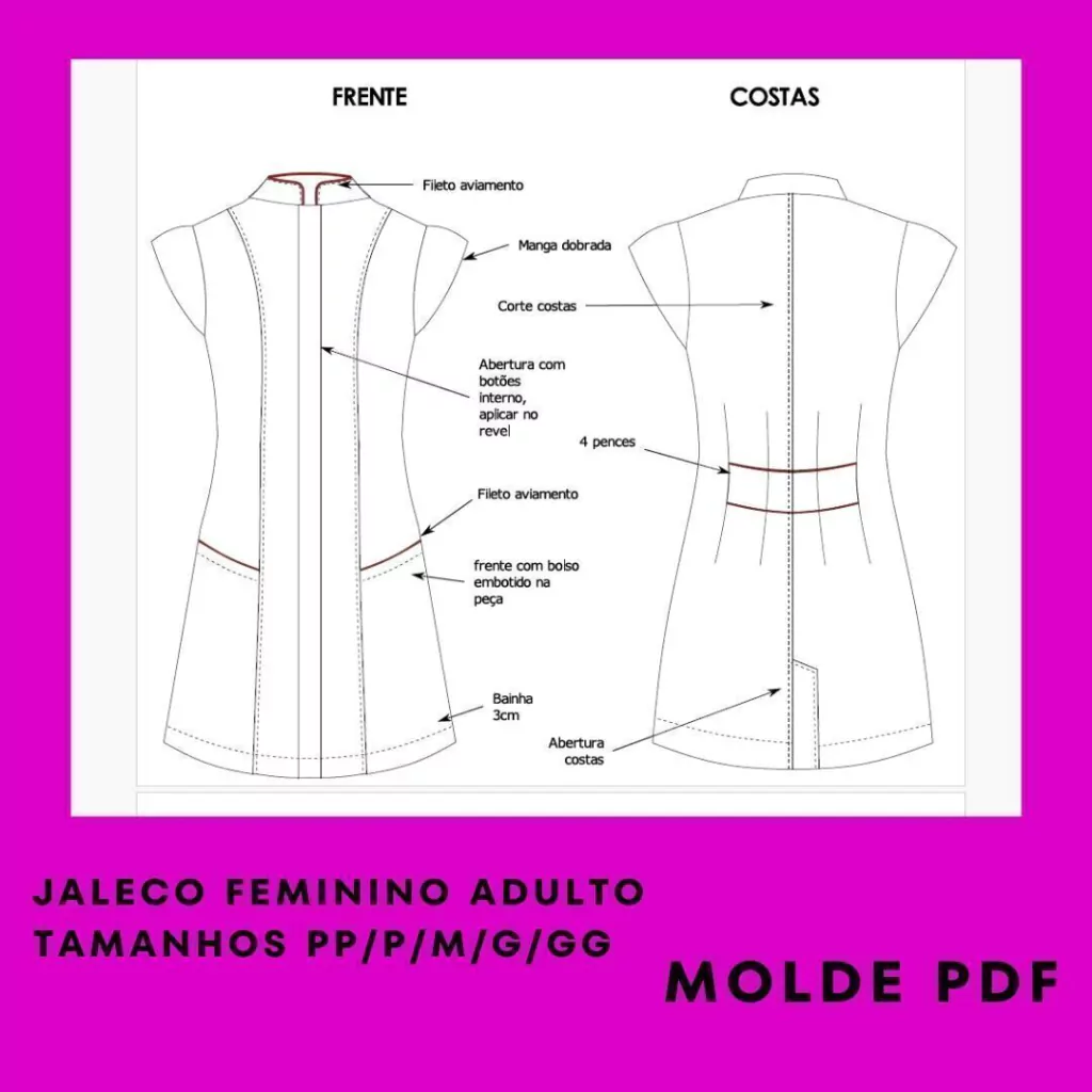 -Arquivo PDF modelagem Jaleco Infantil Feminino Tamanhos PP/P/M/G/GG em A4 separado tamanho por tamanho.