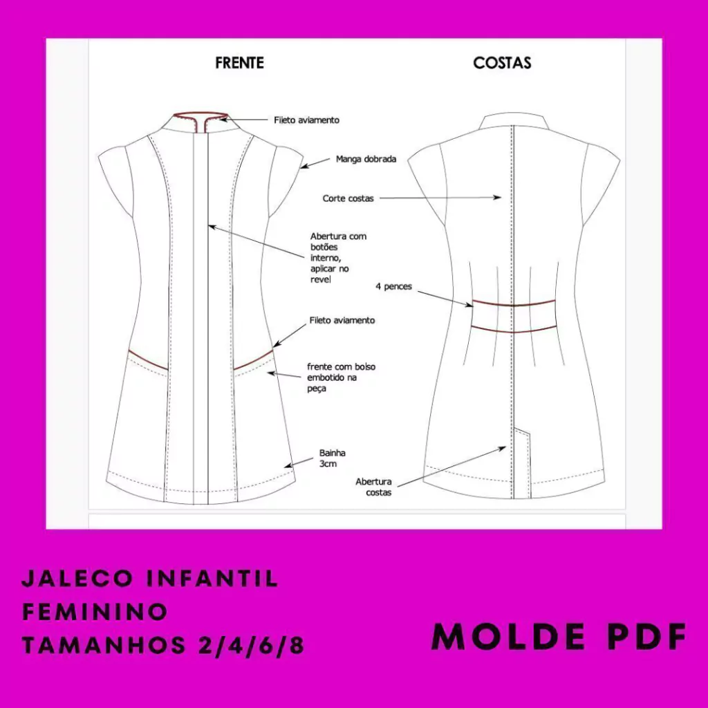 -Arquivo PDF modelagem Jaleco Infantil Feminino Tamanhos 2,4,6,8 em A4 separado tamanho por tamanho.