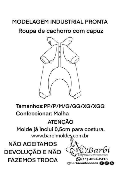 Kit de Modelagem de Roupa de cachorro com capuz e punhos PP/P/M/G/GG/XG/XGG