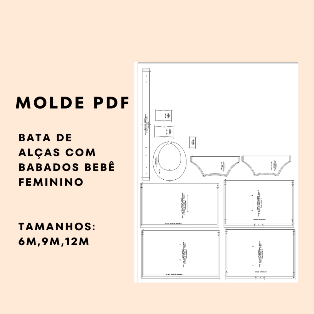 -Arquivo PDF modelagem de Bata de alças com babados Bebê feminino Tamanhos 6 meses, 9 meses e 12 meses em A4 um dentro do outro.