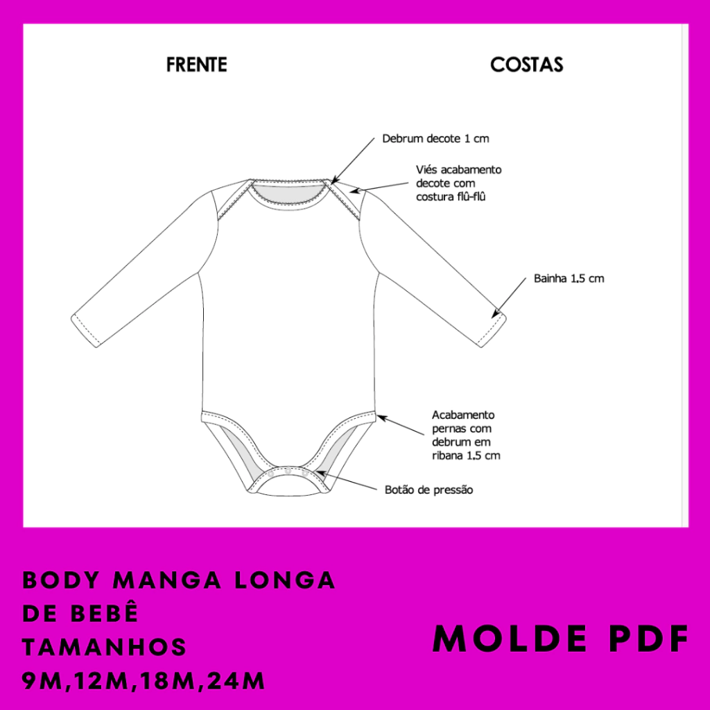 -Arquivo PDF modelagem Body de bebê Manga Longa Tamanhos 9 meses, 12 meses, 18 meses e 24 meses em A4 separado tamanho por tamanho.