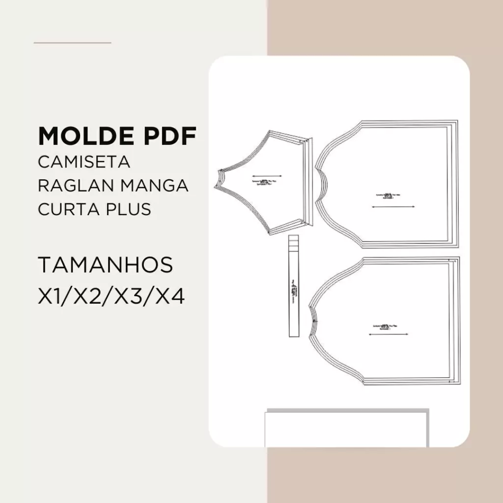 -Arquivo PDF modelagem Camiseta Raglan Manga Curta Plus Masculino Tamanhos X1,X2,X3,X4 em A4 um dentro do outro.