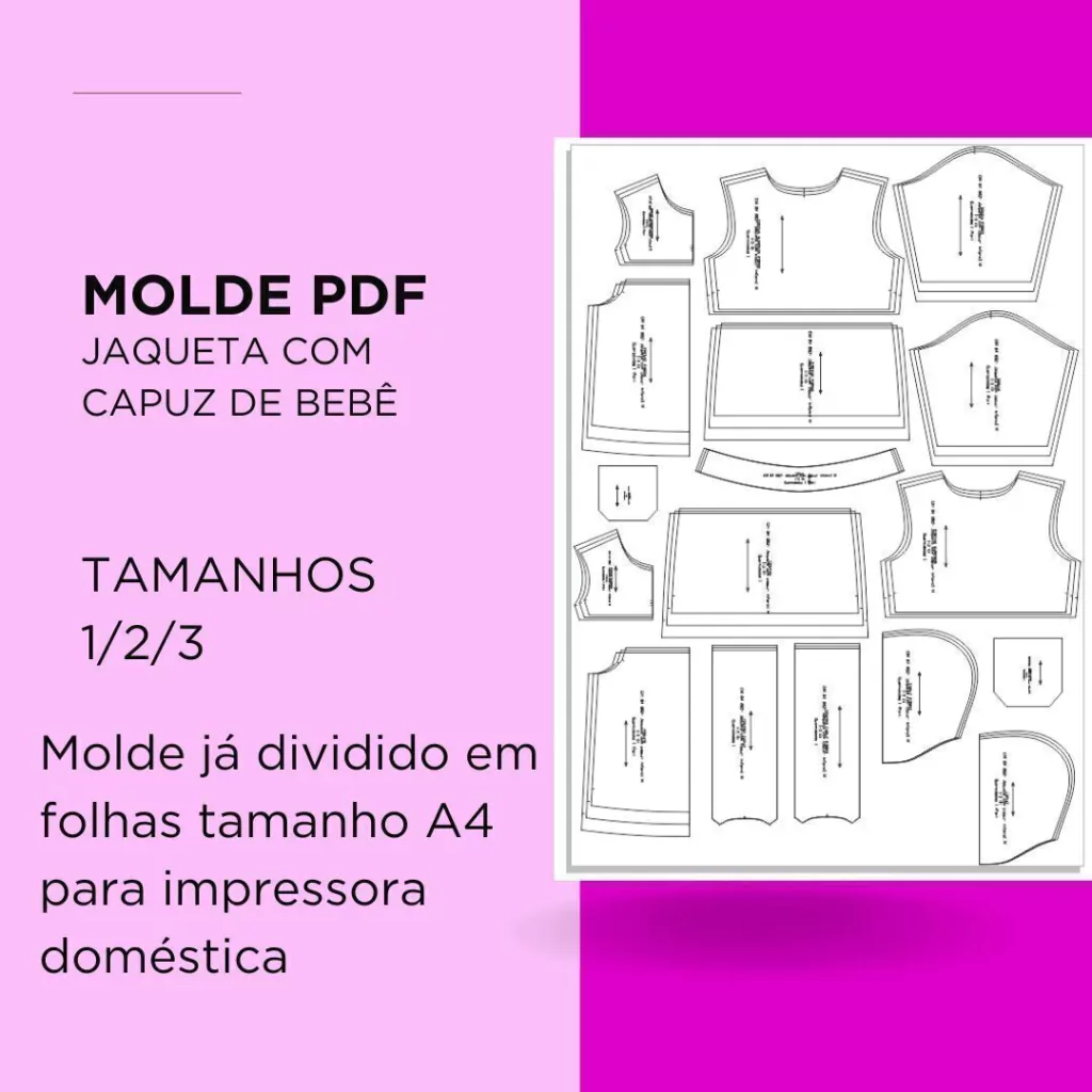 -Arquivo PDF modelagem Jaqueta com capuz de bebê Tamanhos 1/2/3 em A4 separado tamanho por tamanho.