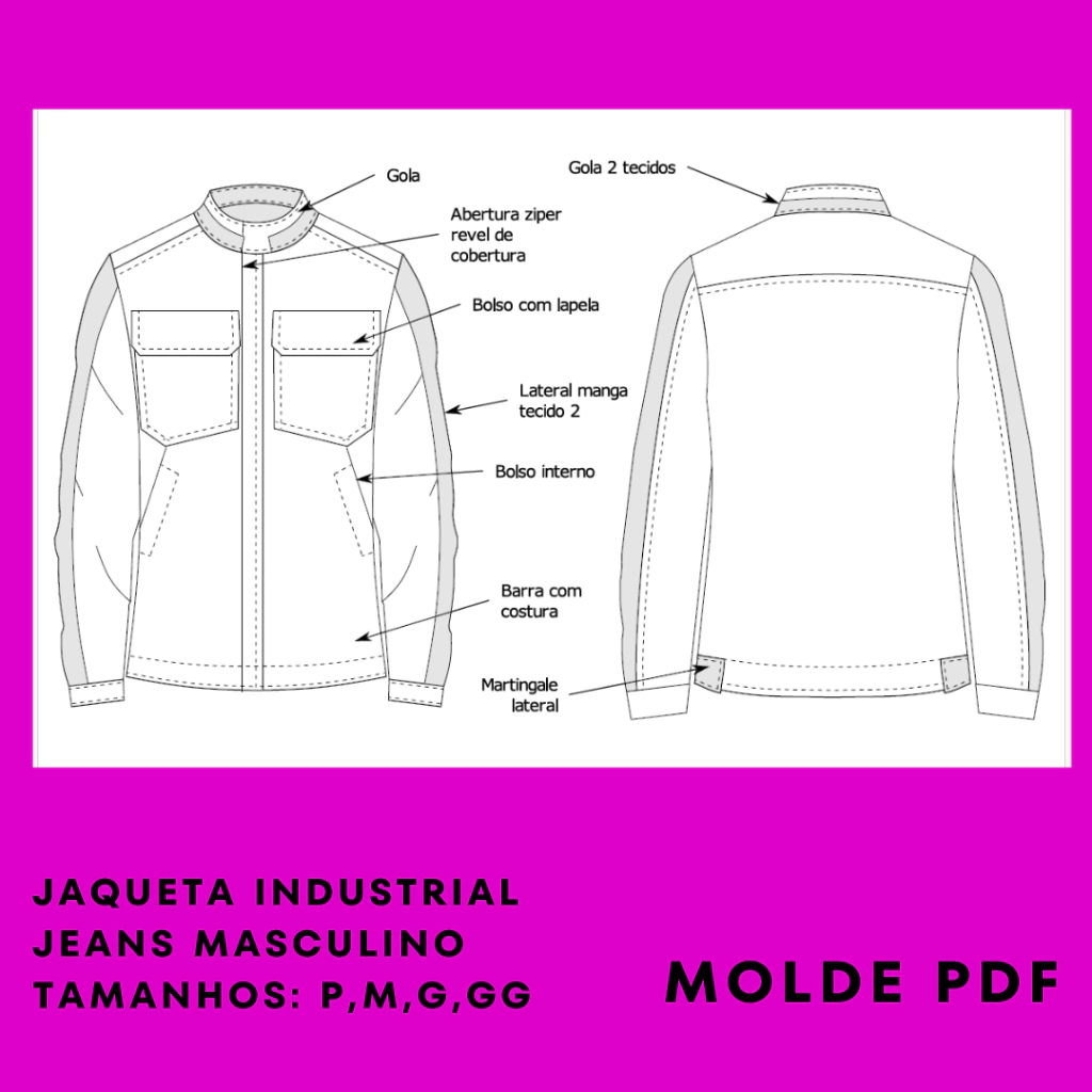 -Arquivo PDF modelagem de Jaqueta Industrial Jeans Masculino Tamanhos P,M,G,GG em A4 separado tamanho por tamanho.