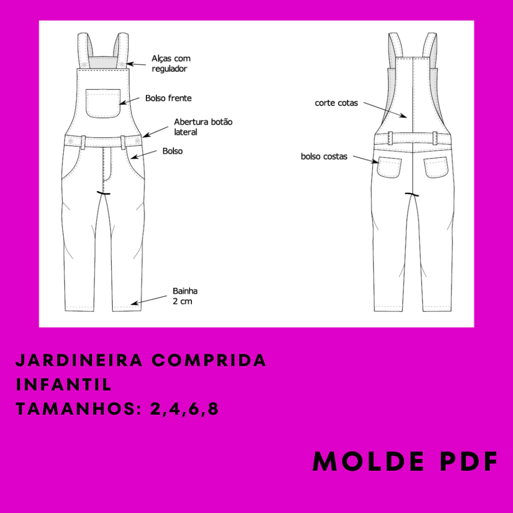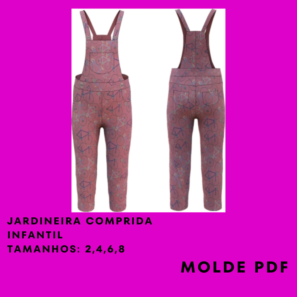 -Arquivo PDF modelagem Jardineira Comprida Infantil Tamanhos 2,4,6,8 em A4 separado tamanho por tamanho.