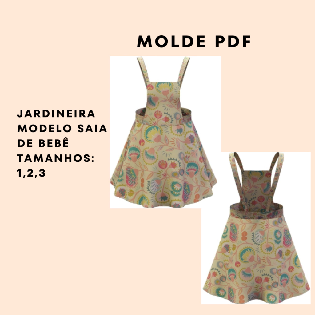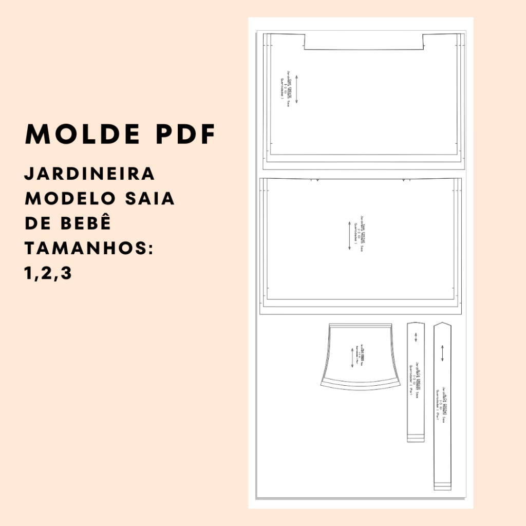 -Arquivo PDF modelagem Jardineira Modelo Saia de Bebê Tamanhos 1,2,3 em A4 separado tamanho por tamanho.