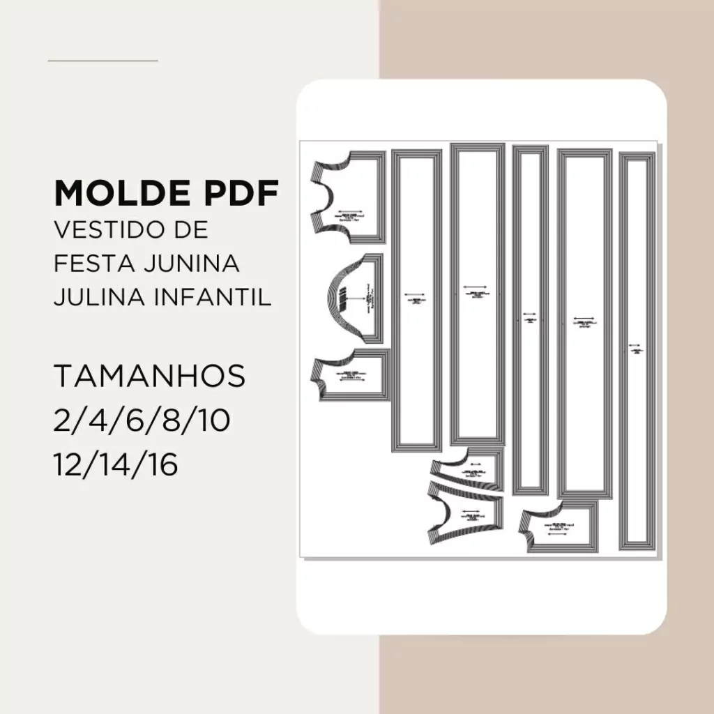 -Arquivo PDF modelagem Vestido de Festa Junina Julina Tamanhos 2/4/6/8/10/12/14/16 em A4 um dentro do outro.