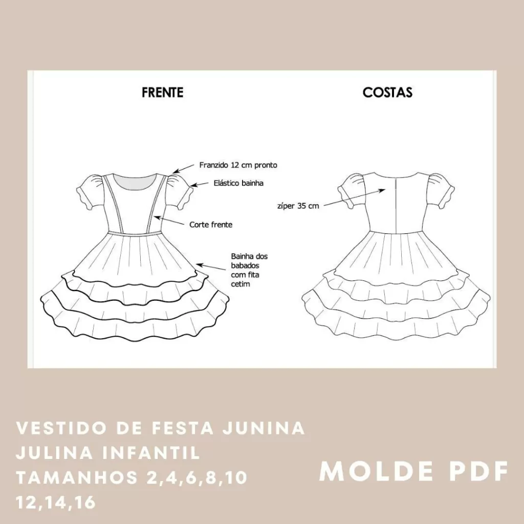-Arquivo PDF modelagem Vestido de Festa Junina Julina Tamanhos 2/4/6/8/10/12/14/16 em A4 separado tamanho por tamanho.
